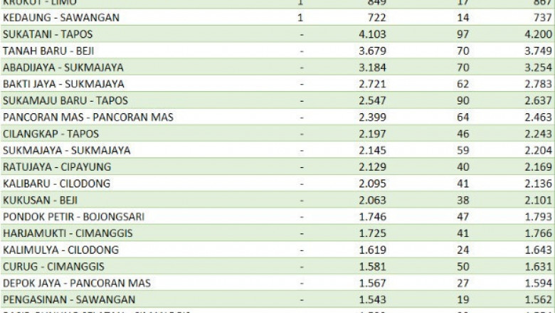 Puluhan kelurahan tersebut antara lain, Sukatani, Tanah Baru, Abadijaya, Bakti Jaya, Sukamaju Baru, Pancoran Mas, Cilangkap, Sukmajaya. Lalu, Kelurahan Ratujaya, Kalibaru, Kukusan, Pondok Petir, Harjamukti, Kalimulya, Curug, Depok Jaya, Pengasinan dan Pasir Gunung Selatan.