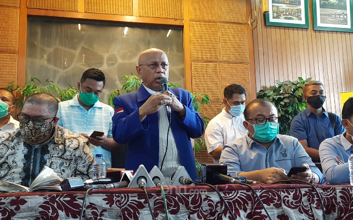Politikus Partai Demokrat Versi KLB Deli Serdang HM Darmizal (tengah) saat konferensi pers di Mega Kuningan.