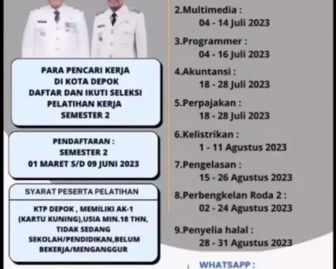 pojokdepok.com – Pelatihan Kerja Semester II yang diselenggarakan Dinas Tenaga Kerja (Disnaker) Kota Depok telah dimulai. Sebanyak sembilan jenis pelatihan akan dilaksanakan di lokasi dan tanggal yang berbeda. Kepala Disnaker Kota Depok, Sidik Mulyono mengatakan, pembukaan pelatihan sudah dilakukan pada 27 Juni