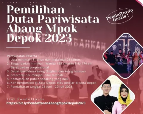 pojokdepok.com – Dinas Pemuda, Olahraga, Kebudayaan, dan Pariwisata (Disporyata) Kota Depok menggelar seleksi pemilihan Abang Mpok Depok Tahun 2023. Adapun pendaftaran dibuka sejak 26 Juni hingga 20 Juli September mendatang. Kepala Bidang Kebudayaan, Pengembangan Kepariwisataan dan Ekonomi Kreatif, Disporyata Kota Depok, Christine
