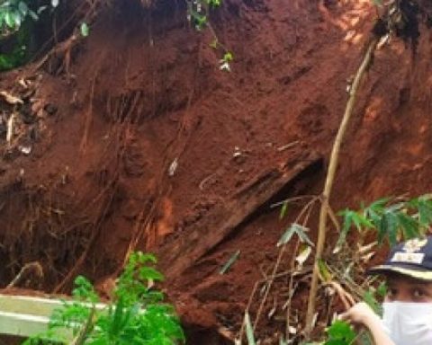 Lurah Kemirimuka Denny Ferdian memperlihatkan area makam yang longsor. (Foto : JD03) pojokdepok.com – Lurah Kemirimuka Denny Ferdian turun langsung meninjau lokasi longsor di area makam RW 09 Kemirimuka, Rabu (13/04/22). Tanah di area makam tersebut bergeser dan longsor ke bawah akibat