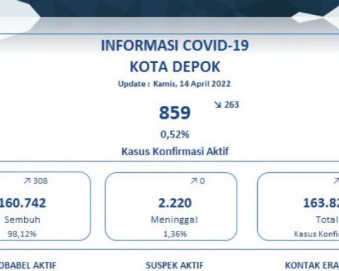 pojokdepok.com– Pemerintah Kota (Pemkot) Depok kembali memperbarui data perkembangan kasus Covid-19 di Kota Depok. Berdasarkan data yang dirilis per tanggal 14 April 2022, terjadi penambahan pada kasus sembuh. Pada hari ini terdapat penambahan pasien sembuh sebanyak 308 orang. Dengan demikian, totalnya menjadi