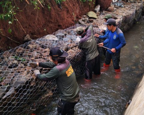 Penanganan longsor di Perumahan Kopwani, Kecamatan Cilodong dengan pembuatan bronjong oleh Satgas DPUPR Kota Depok, Rabu (13/04/22). (Foto: istimewa) pojokdepok.com- Dinas Pekerjaan Umum dan Penataan Ruang (DPUPR) Kota Depok tengah melakukan penanganan longsor Perumahan Kopwani Kelurahan Kalibaru, Kecamatan Cilodong. Saat ini penanganan dilakukan dengan