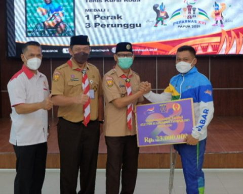 Wakil Wali Kota Depok Imam Budi Hartono memberikan imbal prestasi kepada salah satu atlet berprestasi. (Foto : JD01) pojokdepok.com – Pemerintah Kota (Pemkot) melalui Dinas Pemuda Olahraga Kebudayaan dan Pariwisata (Disporyata) serta Komite Olahraga Nasional Indonesia (KONI) Depok memberikan imbal prestasi untuk