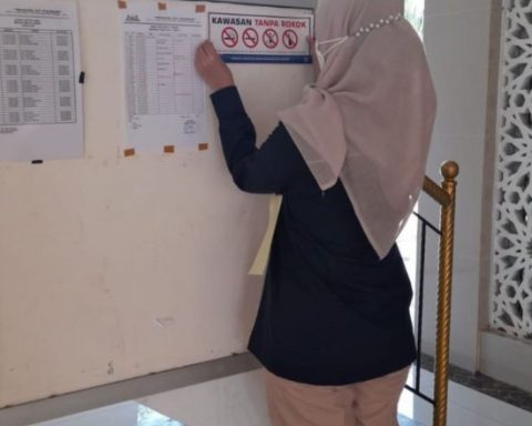Petugas Kesehatan Puskesmas Cipas saat mengunjungi salah satu Masjid dan memasang stiker KTR. (Foto: Istimewa) pojokdepok.com – Unit Pelaksana Teknis Dinas (UPTD) Puskesmas Cisalak Pasar (Cipas) melakukan sosialisasi program Kesehatan Lingkungan. Kegiatan tersebut dilakukan dengan mengunjungi sejumlah tempat umum di wilayah Cipas.
