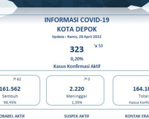 Data perkembangan kasus Covid-19 di Kota Depok per 28 April 2022. (Foto: istimewa). pojokdepok.com– Pemerintah Kota (Pemkot) Depok kembali memperbarui data perkembangan kasus Covid-19 di Kota Depok. Berdasarkan data yang dirilis per tanggal 28 April 2022, terjadi penurunan yang signifikan pada kasus