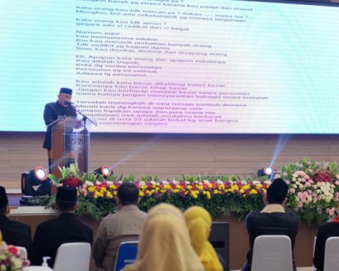 Wali Kota Depok Mohammad Idris saat memberikan sambutan pada puncak acara Hari Jadi ke-23 Kota Depok, di Aula Lantai 10, Gedung Dibaleka II, kemarin (27/04/22). (Foto: JD 04/Diskominfo) pojokdepok.com- Di usia Kota Depok yang memasuki 23 tahun, terdapat beberapa prestasi yang berhasil