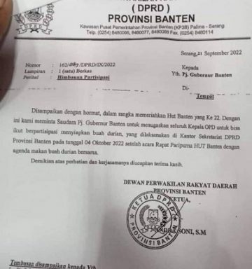 pojokdepok.com -, Beredar surat permintaan durian pada saat rapat paripurna HUT Banten ke 22 dikecam Lembaga Bantuan Hukum (LBH) Tangerang. Surat permintaan yang ditanda-tangani Ketua DPR Banten, Andra Soni tersebut tersebar ke masyarakat. Adapun isi surat tersebut yakni, Pj Gubernur Banten untuk