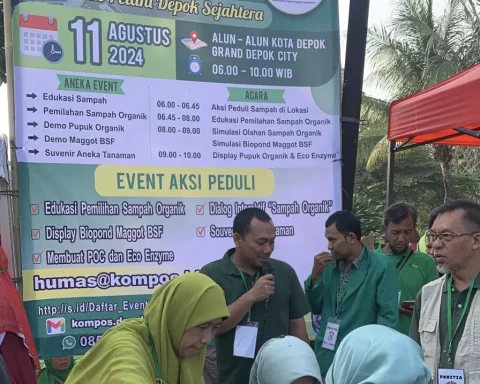 pojokdepok.com – Komunitas Petani Depok Sejahtera (KOMPOS) Kota Depok menggelar Aksi Peduli dengan mengusung tema ‘Sampah Organik Sahabat Tanaman’ di Alun-Alun Kota Depok, Minggu (11/08/24) pagi. Aksi peduli tersebut diselenggarakan dengan tujuan mengajak masyarakat Kota Depok untuk dapat mulai memilah sampah dan