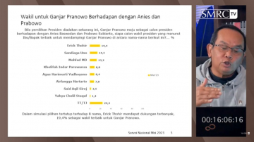 pojokdepok.com – Survei SMRC terhadap kandidat cawapres untuk Ganjar Pranowo menempatkan Menteri BUMN Erick Thohir menjadi figur paling potensial. Berdasarkan survei yang dilakukan Mei 2023, Erick Thohir mendapatkan dukungan 19,4 persen mengungguli Sandiaga Uno (14,3 persen) dan Mahfud MD (13,2 persen). Sekalipun begitu,