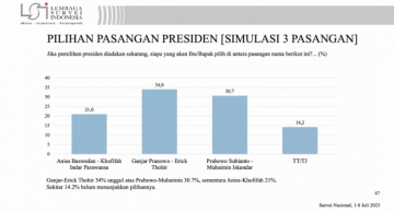pojokdepok.com – Lembaga Survei Indonesia (LSI) merilis hasil survei peta kompetisi Pilpres 2024. Dalam simulasi tiga nama pasangan calon presiden (capres) dan calon wakil presiden (cawapres), pasangan Ganjar Pranowo dan Erick Thohir keluar sebagai pemenang. Pasangan Ganjar-Erick berhasil unggul dari pasangan Prabowo