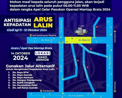 Pojokdepok.com – Warga yang biasa melintas di Jalan Raya Akses UI pada pagi hingga siang hari diimbau untuk mencari jalur alternatif besok, Senin 14 Oktober 2024. Pasalnya, akan ada apel gelar pasukan Operasi Mantap Brata yang akan berlangsung di Markas Komando (Mako)