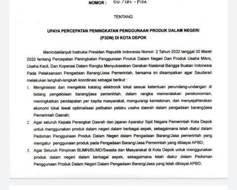 pojokdepok.com- Upaya mempercepat Peningkatan Penggunaan Produk Dalam Negeri (P3DN), Wali Kota Depok Mohammad Idris mengeluarkan Surat Edaran (SE) Nomor 510/285-PSDA tentang Upaya P3DN di Kota Depok. Hal ini juga menindaklanjuti instruksi Presiden Republik Indonesia Nomor: 2 Tahun 2022 tanggal 30 Maret 2022