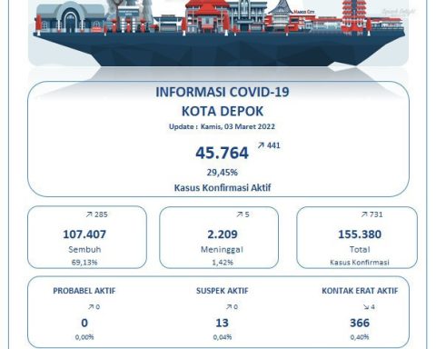 Pojok Depok – Kasus Covid-19 Kota Depok menunjukan tren penurunan penularan aktif. Hal itu dapat dilihat dari informasi harian Covid-19 Kota Depok pada Kamis (3/3/2022). Berdasarkan data yang di rilis Satgas Penanganan Covid-19 Kota Depok. Pada Kamis (3/3/2022), kasus aktif di Kota