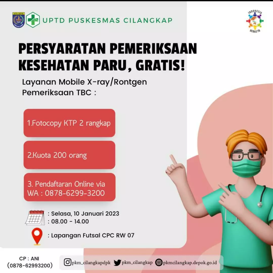 pojokdepok.com – Besok, Unit Pelaksana Teknis Dinas (UPTD) Puskesmas Cilangkap membuka pelayanan pemeriksaan kesehatan paru gratis. Pemeriksaan dimulai pukul 08.00 – 14.00 WIB di Lapangan Futsal CPC Cilangkap.