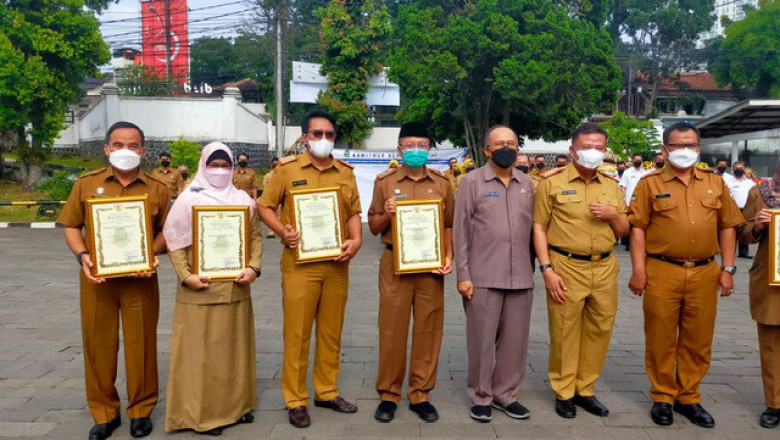 Kepala Disdukcapil Kota Depok, Nuraeni Widayatti (kedua kiri) saat menerima penghargaan kinerja terbaik dari Jabar. (Foto : Istimewa)