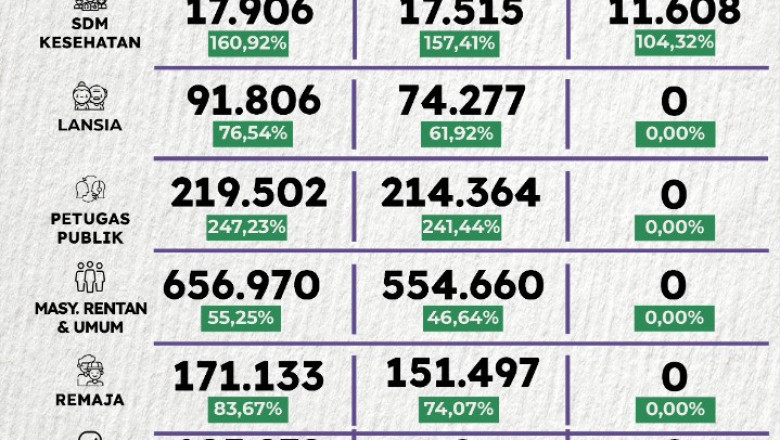 Selanjutnya, kategori petugas publik, dengan rincian sebanyak 219.502 orang mendapatkan vaksin dosis pertama dan 214.364 orang mendapatkan vaksin dosis kedua. Lalu, kategori masyarakat rentan dan umum ada 656.970 orang mendapatkan vaksin dosis pertama. Serta 554.660 orang mendapatkan vaksin dosis kedua.