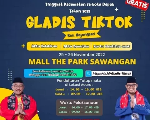 pojokdepok.com- Gebyar Layanan Disdukcapil Tingkat Kecamatan se- Kota Depok (Gladis Tiktok) akan menyambangi warga Kecamatan Sawangan dan Kecamatan Bojongsari pada 25 dan 26 November 2022. Warga bisa melakukan pendaftaran secara online melalui link https://s.id/Gladis-Tiktok. Kepala Disdukcapil Kota Depok, Nuraeni Widayatti mengatakan,