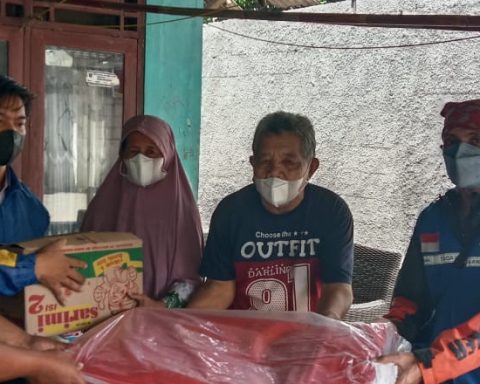 Pemilik rumah yang rusak akibat hujan disertai angin kencang di RT 03 RW 09 Kelurahan Mampang, Kecamatan Pancoran Mas saat menerima bantuan dari Taruna Siaga Bencana (Tagana) Kota Depok, kemarin (21/02/22). (Foto: istimewa). pojokdepok.com – Lurah Mampang, Darmawansyah bersama Taruna Siaga Bencana