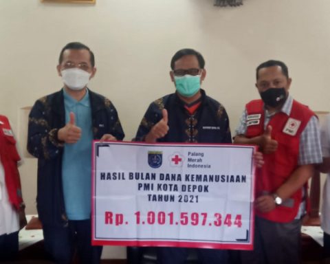Penyerahan secara simbolis dari panitia Bulan Dana PMI ke pengurus PMI Kota Depok di ruang kerja Wakil Wali Kota Depok, Imam Budi Hartono, Selasa (22/03/22). (Foto: istimewa) pojokdepok.com- Bulan Dana Palang Merah Indonesia (PMI) Kota Depok tahun 2021 telah ditutup. Kegiatan tersebut
