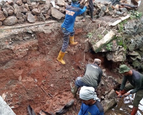 Satu regu Satuan Tugas (Satgas) yang terdiri dari 10 personel diturunkan untuk melakukan penanganan longsor turap di depan SDN 1 Beji, Kecamatan Beji, Selasa (15/03/22). (Foto: istimewa) pojokdepok.com- Dinas Pekerjaan Umum dan Penataan Ruang (DPUPR) Kota Depok mengerahkan sebanyak satu regu Satuan Tugas (Satgas)
