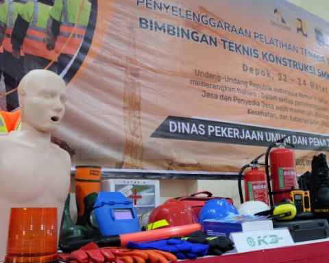 Perlengkapan K3 saat ditampilkan DPUPR Kota Depok pada kegiatan Sistem Manajemen Keselamatan Konstruksi (SMKK) di Sasono Mulyo, Kalimulya, Rabu (23/03/22). (Foto: JD 01/Diskominfo). pojokdepok.com- Kepala Dinas Pekerjaan Umum dan Penataan Ruang (DPUPR) Kota Depok Citra Indah Yulianty, menekankan kepada peserta Sistem Manajemen Keselamatan