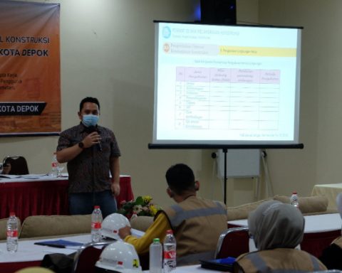 Pemateri SMKK R. Herdian Bayu, memberikan materi terkait rancangan konseptual SMKK kepada peserta Bimtek, di Aula Sasono Mulyo, kemarin (23/03/22). (Foto: JD 01/Diskominfo) pojokdepok.com- Memasuki hari kedua pelatihan Sistem Manajemen Keselamatan Konstruksi (SMKK), peserta yang terdiri dari Aparatur Sipil Negara (ASN) Dinas