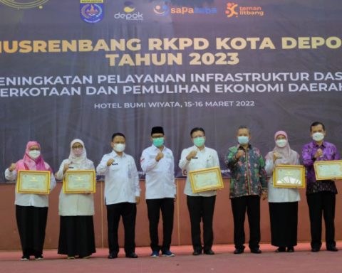 Wakil Wali Kota Depok, Imam Budi Hartono (tengah) didampingi Sekretaris Daerah Kota Depok, Supian Suri usai memberikan penghargaan SAPA SABA Award 2022 kepada lima Perangkat Daerah dengan Perencanaan, Pelaksanaan & Evaluasi Pelaporan PembangunanTerbaik Tahun 2022, di Hotel Bumi Wiyata, kemarin (16/03/22). (Foto: