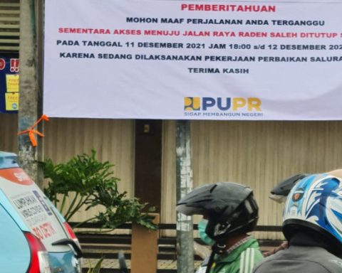 Spanduk pemberitahuan Jalan Raya Raden Saleh ditutup sementara karena ada pengerjaan drainase oleh DPUPR Kota Depok. (Foto: istimewa) pojokdepok.com- Perbaikan saluran air atau drainase di Jalan Raya Raden Saleh, Kecamatan Sukmajaya yang dilakukan oleh Dinas Pekerjaan Umum dan Penataan Ruang (DPUPR) Kota