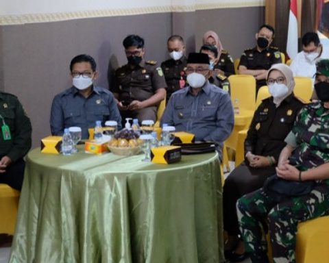 Wali Kita Depok Mohammad Idris (tengah) menghadiri Launching Kampung Restorative oleh Jaksa Agung RI secara virtual di Aula Kejaksaan Negeri Depok, Rabu (16/03/22). pojokdepok.com – Wali Kota Depok Mohammad Idris memberikan dukungan penuh terhadap rencana dibentuknya Rumah Restorative Justice (RJ) oleh Kejaksaan Negeri