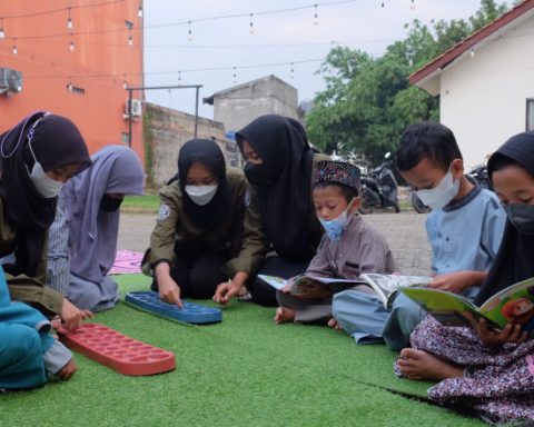 Forum Anak Kota Depok bersama anak-anak sedang membaca buku dan bermain permainan tradisional saat kegiatan Semarak Ramadhan Berbagi (Serabi), di Masjid Al Mu’izzu Kelurahan Meruyung, Kecamatan Limo, Jumat (15/04). (Foto: JD 01/Diskominfo) pojokdepok.com – Dinas Pemberdayaan Perempuan Perlindungan Anak Pengendalian Penduduk dan Keluarga