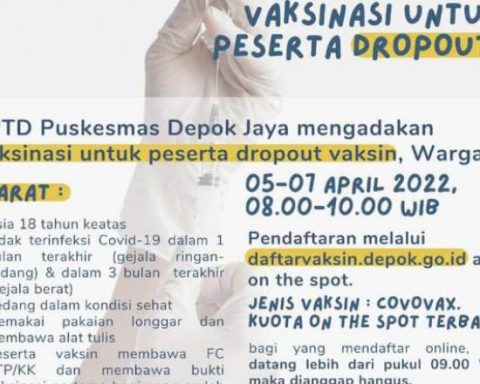 Informasi mengenai layanan vaksinasi dropout bagi masyarakat Kota Depok di UPTD Puskesmas Depok Jaya. (Foto: tangkapan layar). pojokdepok.com – Unit Pelaksana Teknis Dinas (UPTD) Puskesmas Depok Jaya membuka pelayanan drop out vaksin. Pelayanan ini untuk penerima vaksin dosis pertama yang tidak melakukan