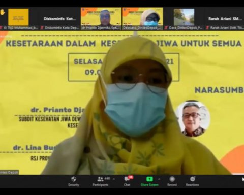 Kepala Bidang P2P Dinkes Kota Depok Umi Zakiati saat memberikan arahan dalam Seminar Kesehatan Jiwa. (Foto: Istimewa) pojokdepok.com – Ratusan pelajar SMP dan SMA di Kota Depok mengikuti web-seminar (Webinar) Kesehatan Jiwa. Kegiatan yang digagas Dinas Kesehatan (Dinkes) Kota Depok tersebut digelar dalam