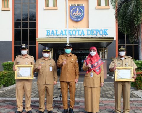Wakil Wali Kota Depok, Imam Budi Hartono didampingi Sekretaris Daerah Supian Suri dan Kepala Dinas Kesehatan Mary Liziawati memberikan piagam penghargaan Capaian Indikator Kesehatan Terbaik 2021 kepada Kelurahan Pangkalan Jati dan Cisalak Pasar saat apel pagi di Halaman Balai Kota, Senin (04/04/22).