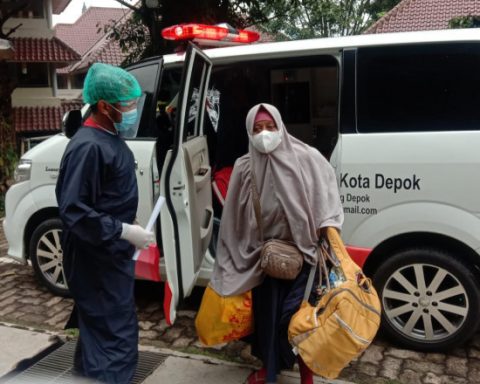 PMI Kota Depok saat mengantarkan seorang pasien Covid-19 ke Pusat Studi Jepang (PSJ) Universitas Indonesia (UI) untuk menjalani isolasi, kemarin (08/02/22). (Foto: istimewa). pojokdepok.com – Petugas Palang Merah Indonesia (PMI) Kota Depok mengevakuasi satu pasien terkonfirmasi positif Covid-19 ke tempat isolasi terpusat di