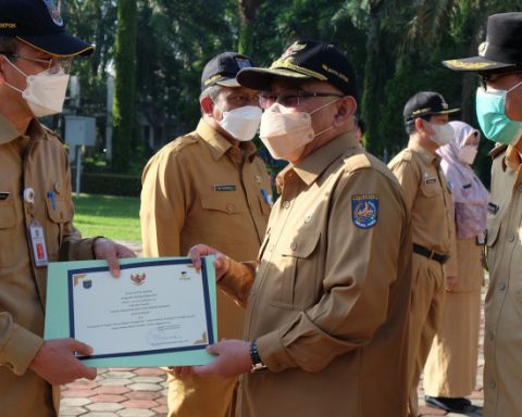 Wali Kota Depok, Mohammad Idris saat memberikan penghargaan kepada Kepala Disrumkim Kota Depok, Dudi Mi’raz atas serapan anggaran tahun 2021 tertinggi yang dicatatkan dinasnya, belum lama ini. (Foto: JD 01/Diskominfo) pojokdepok.com – Dinas Perumahan dan Permukiman (Disrumkim) Kota Depok mencatatkan serapan anggaran