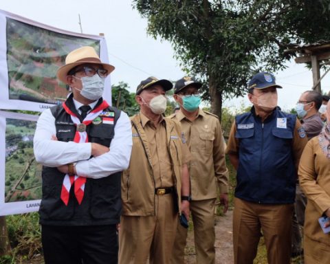 Gubernur Jabar, Ridwan Kamil bersama Wali Kota Depok, Mohammad Idris, Wakil Wali Kota Depok, Imam Budi Hartono, Kepala Bappeda Kota Depok, Dadang Wihana serta Kepala DPUPR Kota Depok Citra Indah Yulianty saat meninjau lahan yang rencananya akan dijadikan alun-alun Kota Depok wilayah