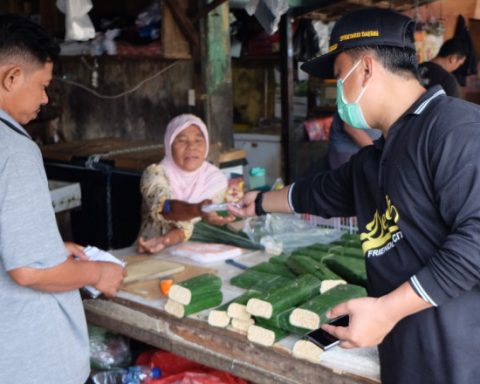 Sekda Kota Depok, Supian Suri memberikan masker kepada pedagang di Pasar Kemiri Muka, Kecamatan Beji, Rabu (26/01/22). (Foto: JD 01/Diskominfo). pojokdepok.com – Sekretaris Daerah (Sekda) Kota Depok, Supian Suri membagikan sebanyak 1.000 masker secara gratis kepada pengunjung dan pedagang di area Pasar