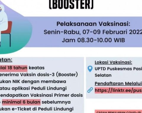 pojokdepok.com – Unit Pelaksana Teknis Dinas (UPTD) Puskesmas Pasir Gunung Selatan (PGS) mulai memberikan pelayanan vaksinasi Covid-19 dosis ketiga atau booster untuk masyarakat. Vaksin booster tersebut mulai dilakukan pada Senin (07/02) mendatang. Kepala UPTD Puskesmas PGS, Sulaeman Iskandar mengatakan, saat ini sudah