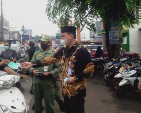 Lurah Kalibaru, Indra Cahyadi membagikan masker kepada pengendara motor yang melintas di Jalan Abdul Gani, Kecamatan Cilodong. (Foto: istimewa). pojokdepok.com – Aparatur Sipil Negara (ASN) bersama kepolisian dan TNI atau tiga pilar Kelurahan Kalibaru Kecamatan Cilodong membagikan masker secara gratis kepada warga yang