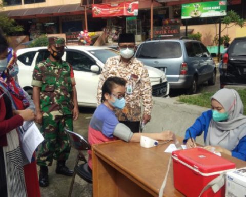 Lurah Abadijaya, Shodik Murdiono meninjau pelaksanaan vaksinasi di Pasar Agung, Kecamatan Sukmajaya, Kamis (24/02/22). (Foto: istimewa) pojokdepok.com – Sebanyak 200 orang yang terdiri dari pedagang dan pengunjung di Pasar Agung, hari ini menjalani vaksinasi Covid-19. Kegiatan ini digelar oleh Koramil 03/Sukmajaya berkerja