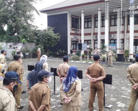 Kegiatan Apel Pagi di Kantor Kecamatan Cipayung, Rabu (26/01/22). (Foto: istimewa). pojokdepok.com- Camat Cipayung, Hasan Nurdin mengimbau warganya untuk memperketat penerapan protokol kesehatan (prokes) saat beraktivitas. Pasalnya, dalam sepekan terakhir, kasus konfirmasi aktif Covid-19 mengalami lonjakan drastis. “Saat ini kasus mulai merangkak.