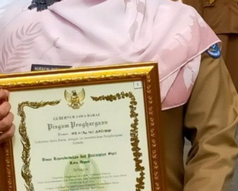 Kepala Disdukcapil Kota Depok, Nuraeni Widayatti menerima penghargaan juara dua penilaian kinerja terbaik administrasi kependudukan (Adminduk) Juara se-Jawa Barat (Jabar). Penghargaan tersebut diberikan bertepatan dengan peringatan hari jadi ke-5 Disdukcapil Provinsi Jabar, Senin (31/01/22) di Kantor Disdukcapil Jabar Kota Bandung. (Foto : Istimewa)