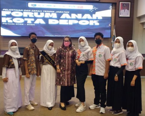 Kepala Bidang Pemenuhan Hak Anak DP3AKB Provinsi Jawa Barat, Rumondang Rumapea (tengah) bersama pengurus Forum Anak Kota Depok, usai pelantikan di Aula Lantai 10, Gedung Dibaleka II, Jumat (11/02/22). (Foto: JD 05/Diskominfo). pojokdepok.com – Dinas Pemberdayaan Perempuan Perlindungan Anak dan Keluarga Berencana