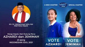 Wali Kota Depok, Mohammad Idris mengajak masyarakat untuk mendukung Azhardi Athariq warga Kecamatan Cilodong dan Jemimah Cita warga Kecamatan Cinere, yang mengikuti kompetisi panggung Indonesia Idol Special Season. “Saya bersama warga Depok bangga terhadap dua Ananda kita ini. Mereka masuk 10 besar