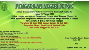pojokdepok.com– Pengadilan Negeri (PN) Depok akan meniadakan pelayan selama lima hari yaitu mulai 28 Juni hingga 02 Juli 2021. Pelayanan dihentikan sementara untuk memutus penularan Covid-19 di lingkungan instansi pemerintah tersebut. Humas PN Depok, Ahmad Fadil mengatakan, langkah ini dilakukan karena terdapat