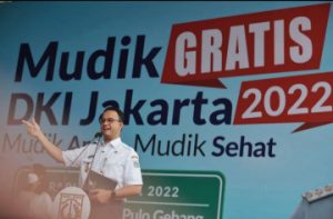 pojokdepok.com -, Pelepas peserta mudik gratis yang diselenggarakan Pemprov DKI Jakarta di Terminal Pulo Gebang, Jakarta Timur, Rabu (27/4/2022) dihebohkan dengan pembagian baju berwarna putih bertuliskan “Anies Baswedan Presiden Indonesia”. Pelepasan mudik gratis yang difasilitasi Pemprov dengan menyediakan 292 unit bus dengan