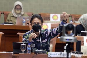 Menteri Kesehatan Budi Gunadi Sadikin mengikuti rapat kerja dengan Komisi IX di Kompleks Parlemen MPR/DPR-DPD, Senayan, Jakarta, Senin (17/1/2022). Rapat kerja tersebut membahas program kerja Kementerian Kesehatan Tahun 2022 serta memberikan penjelasan terkait program penanganan penyakit berbiaya tinggi (Katastropik) baik Penyakit Menular (PM)