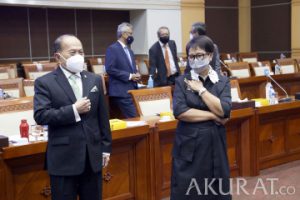 Menteri Luar Negeri Retno Marsudi berincang dengan Wakil Ketua MPR yang juga anggota Komisi I Syarief Hasan sebelum dimulainnya rapat kerja dengan Komisi I DPR di Kompleks Parlemen MPR/DPR-DPD, Senayan, Jakarta, Senin (14/2/2022). Rapat kerja tersebut diantaranya membahas usulan reaktivasi pembukaan hubungan diplomatik