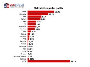 pojokdepok.com — Partai Demokrasi Indonesia Perjuangan (PDIP) tetap menjadi pilihan teratas dalam preferensi partai politik yang dipilih masyarakat jika pemilu digelar saat ini. Berdasarkan hasil survei Voxpopuli Research Center yang dirilis pada Kamis (16/12), partai berlambang banteng itu dipilih oleh 16,3 persen
